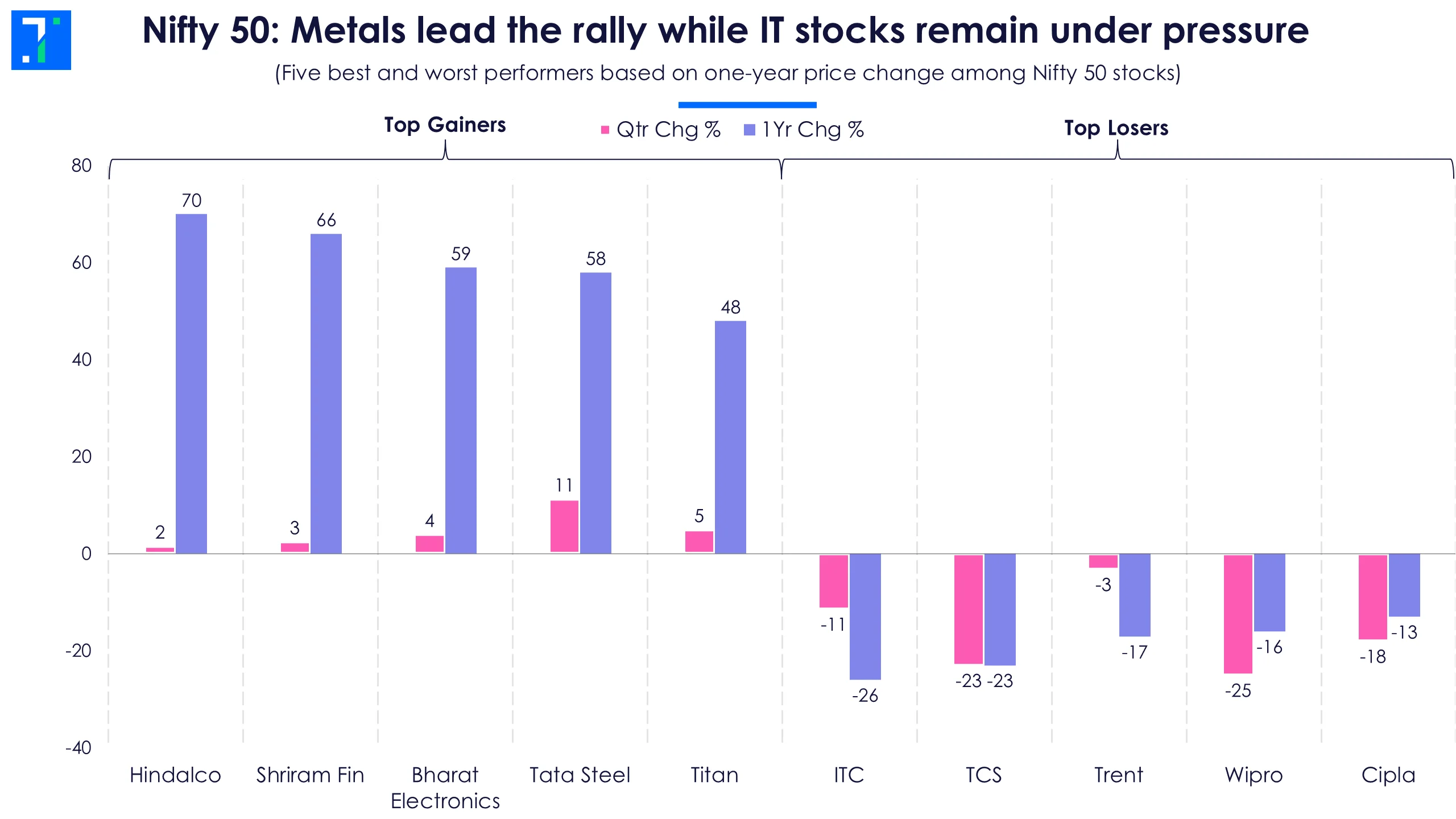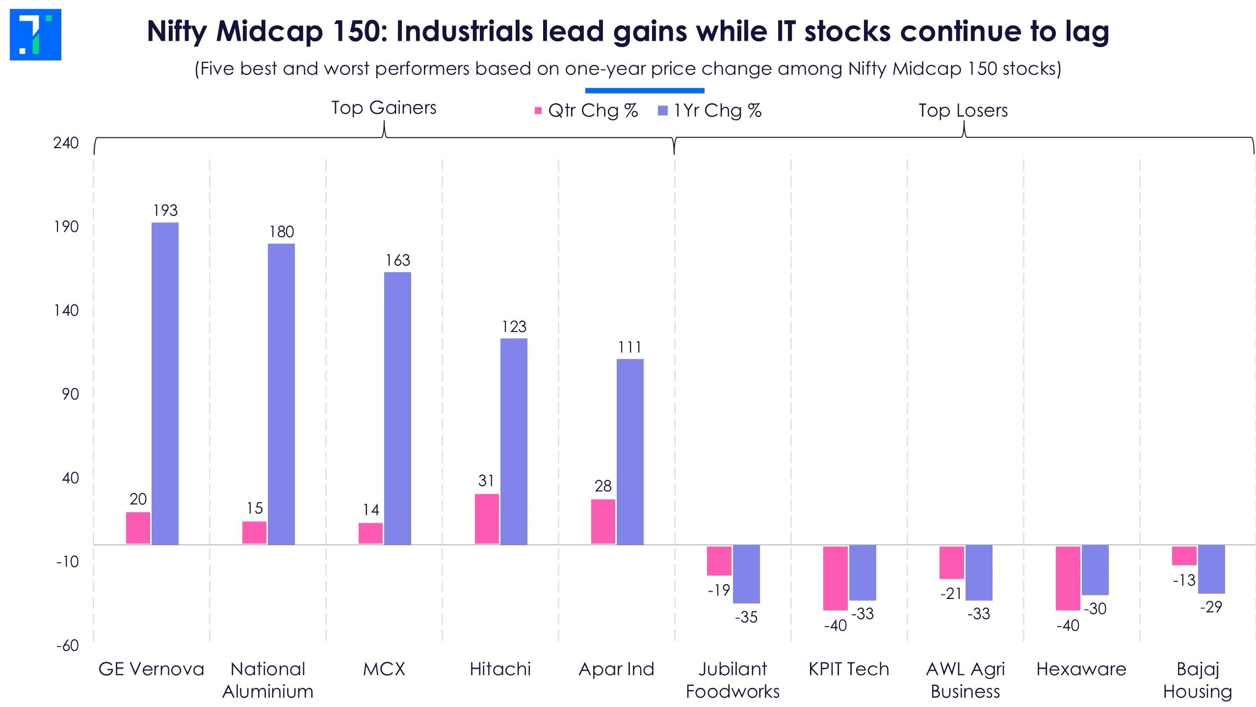 Largecap and midcap gainers today include Thermax Ltd. (3,535.10, 7.4%), Hitachi Energy India Ltd. (27,315, 5.4%) and GE Vernova T&D India Ltd. (3,911.30, 5%).