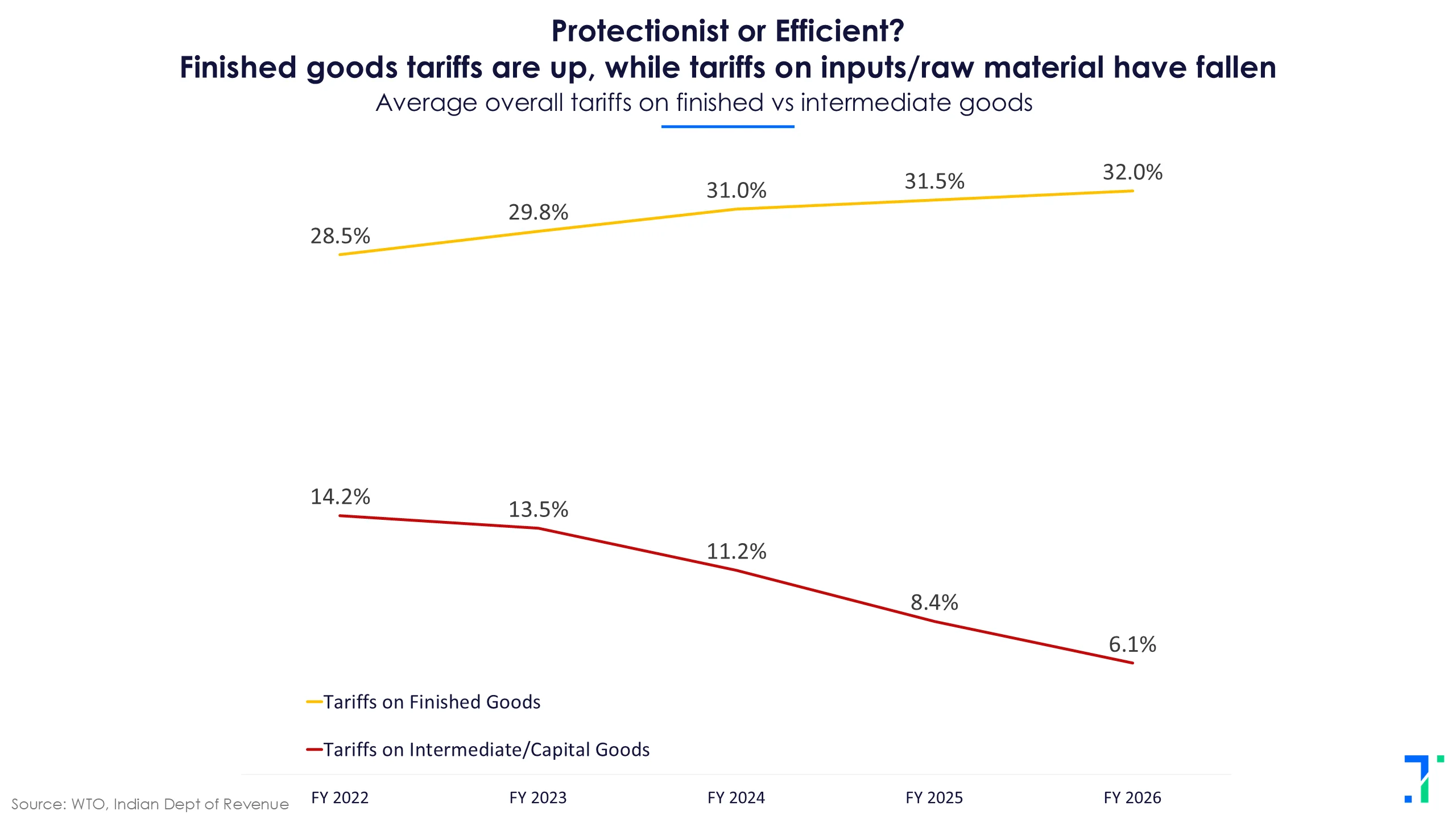 India's tariff cuts have been narrow, but show some clear priorities. It has slashed tariffs for intermediate goods that Indian factories need, while keeping it high for finished goods. For example, India has kept tariffs high on items like ready to wear clothing, footwear, toys, furniture, and cars (although this will fall following the EU deal).