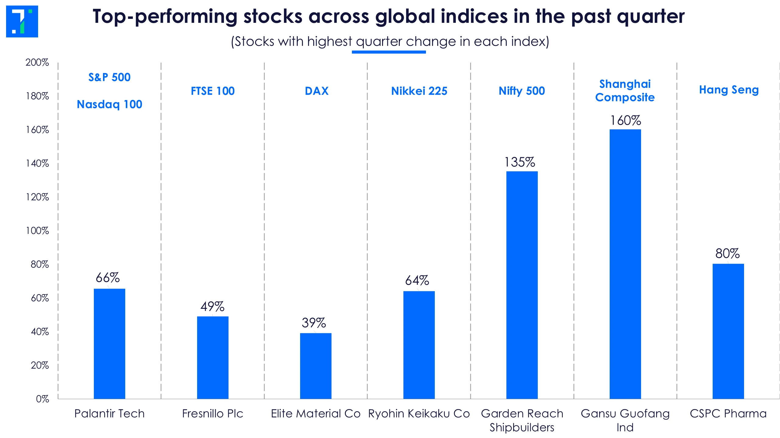 Despite continued global upheaval, indices recovered in the past quarter. The top stock gainers in the respective indices indicate that tech was the top performer for the US, while energy, pharma, and industrials won elsewhere.