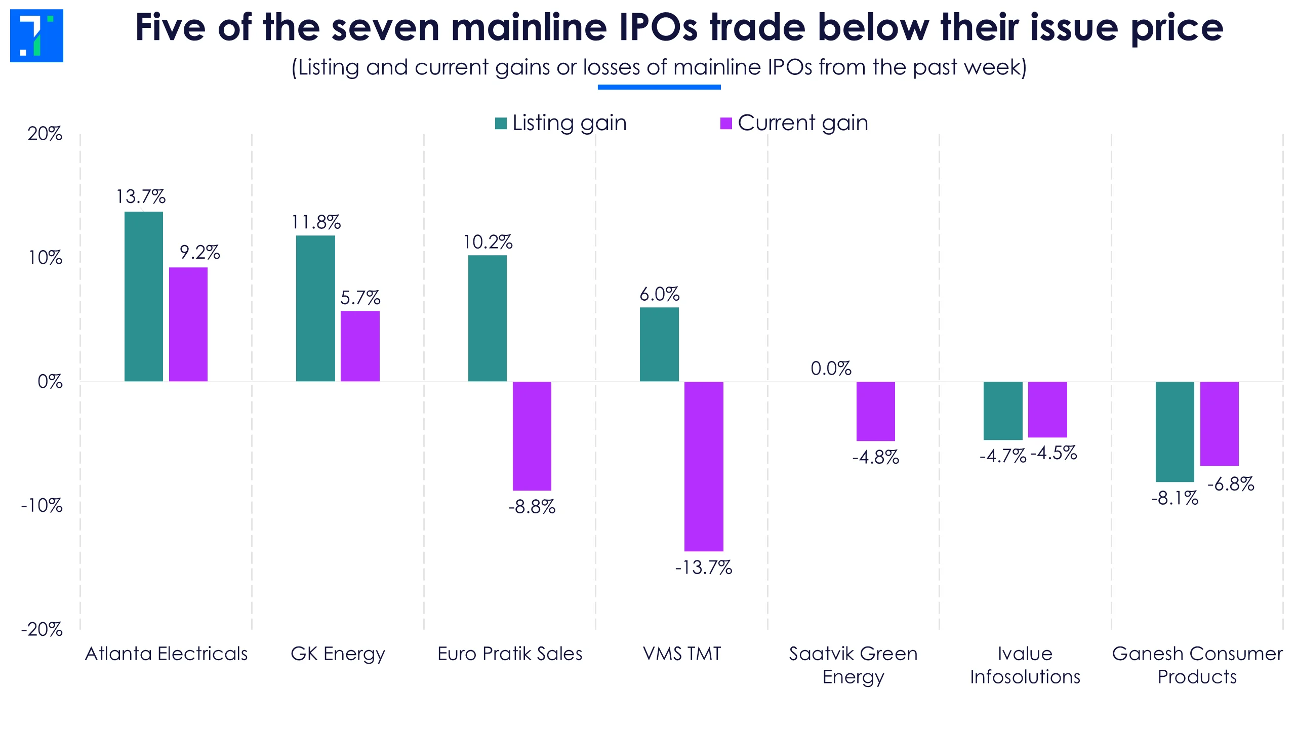 GK Energy and Euro Pratik Sales listed at 11.8% and 10.2% premiums. GK Energy is now trading 5.7% above its issue price after its IPO was oversubscribed by 89.6X, while Euro Pratik is down 8.8%.