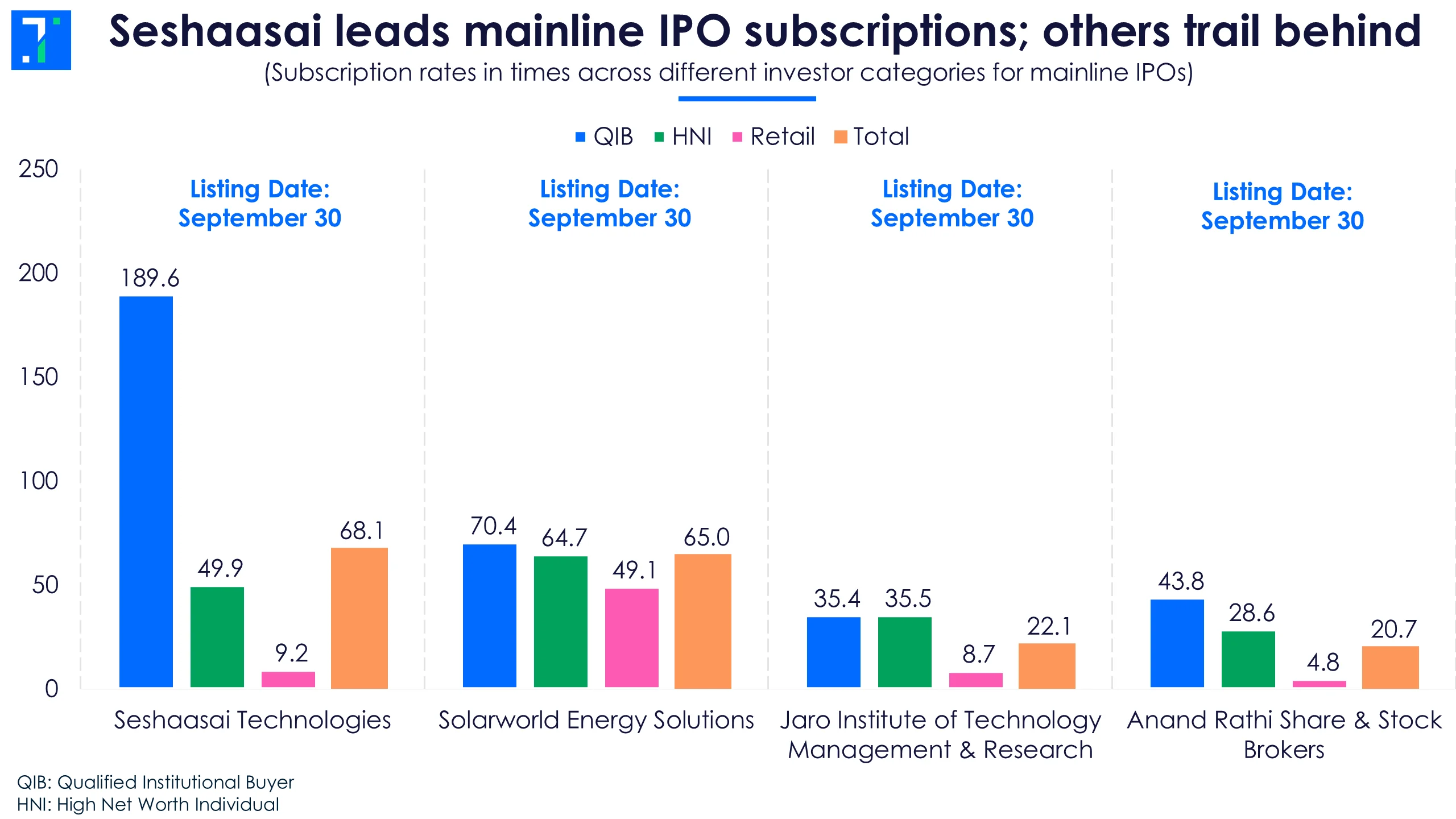 Among mainline IPOs, Seshaasai Technologies stood out with bids for 68.1X the shares on offer, with QIBs showing strong interest at 189.6X. The company is set to list on September 30. Seshaasai Technologies is a technology solutions provider offering payment and communication solutions to the banking, financial services, and insurance (BFSI) industry.