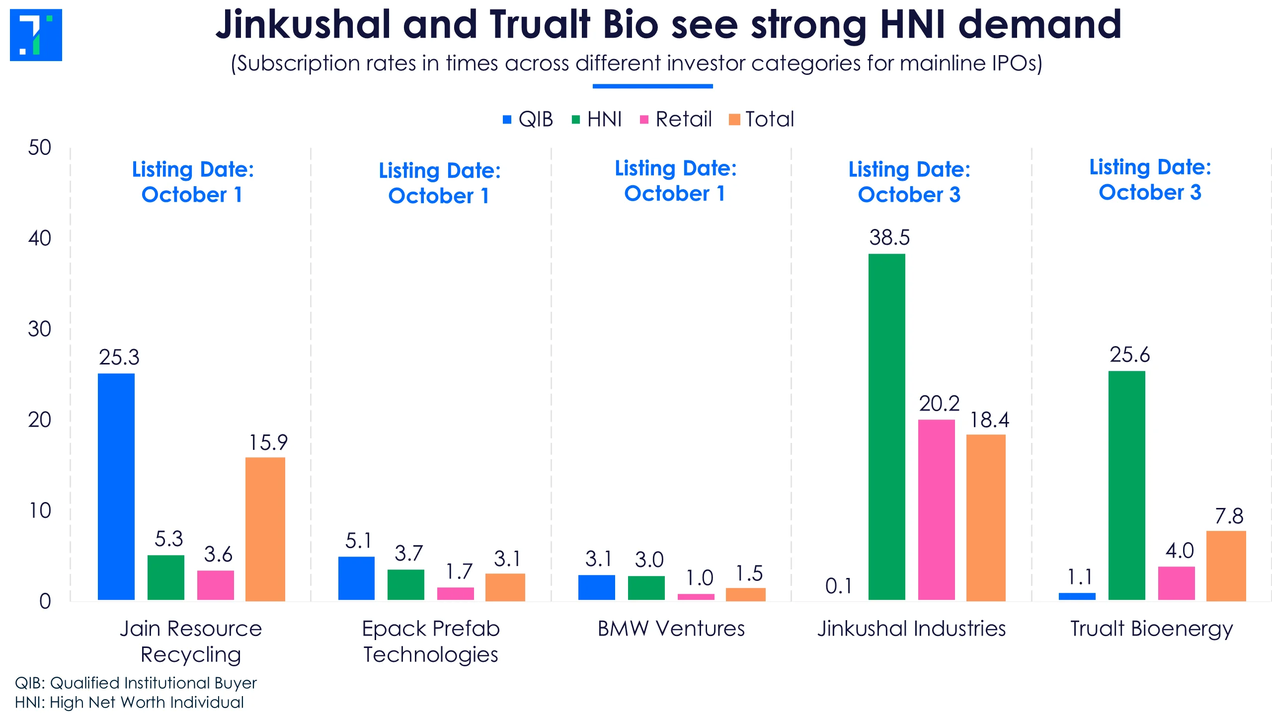 Trualt Bioenergy and Jinkushal Industries are set for listing on October 3. Trualt received bids for 0.8X the shares on offer, while Jinkushal received bids for 5.1X as of day 2.