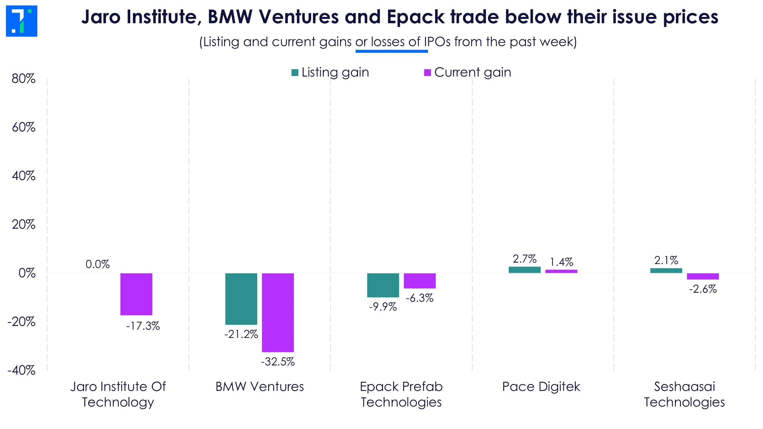 Jaro Institute Of Technology made a flat debut at Rs 890 and is currently trading 17.3% below its issue price. Meanwhile, BMW Ventures and Epack Prefab Technologies had a weak start, listing at 21.2% and 9.9% discounts, respectively.