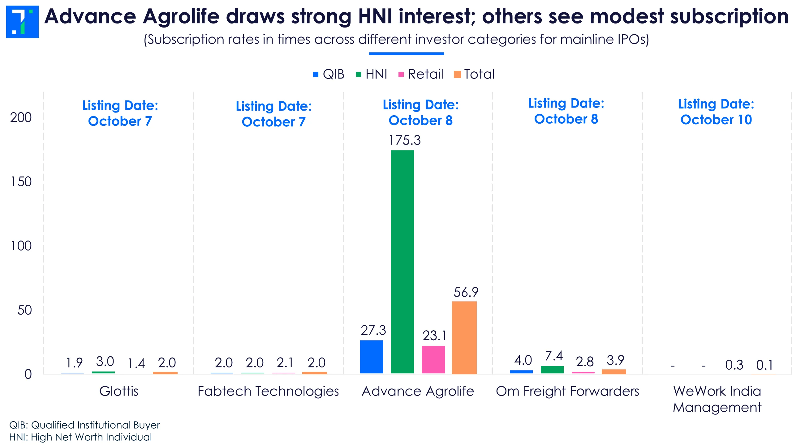 - Dhillon Freight Carrier and Om Metallogic are set for listing on October 7. Dhillon Freight’s IPO received bids for 2.8X the shares on offer, while Om Metallogic was oversubscribed at 1.4X.