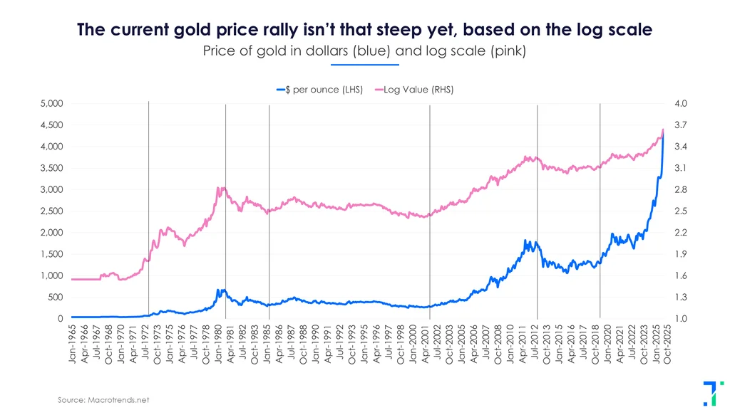 Look at gold’s price on a logarithmic scale, and the bull story is even more convincing. By that measure, we’re still in the early to mid-phase of a long bull cycle. Forecasts for gold prices in 2026 range between $4,400 and $5,000 — a 10–15% upside, smaller than this year’s fireworks but still impressive.