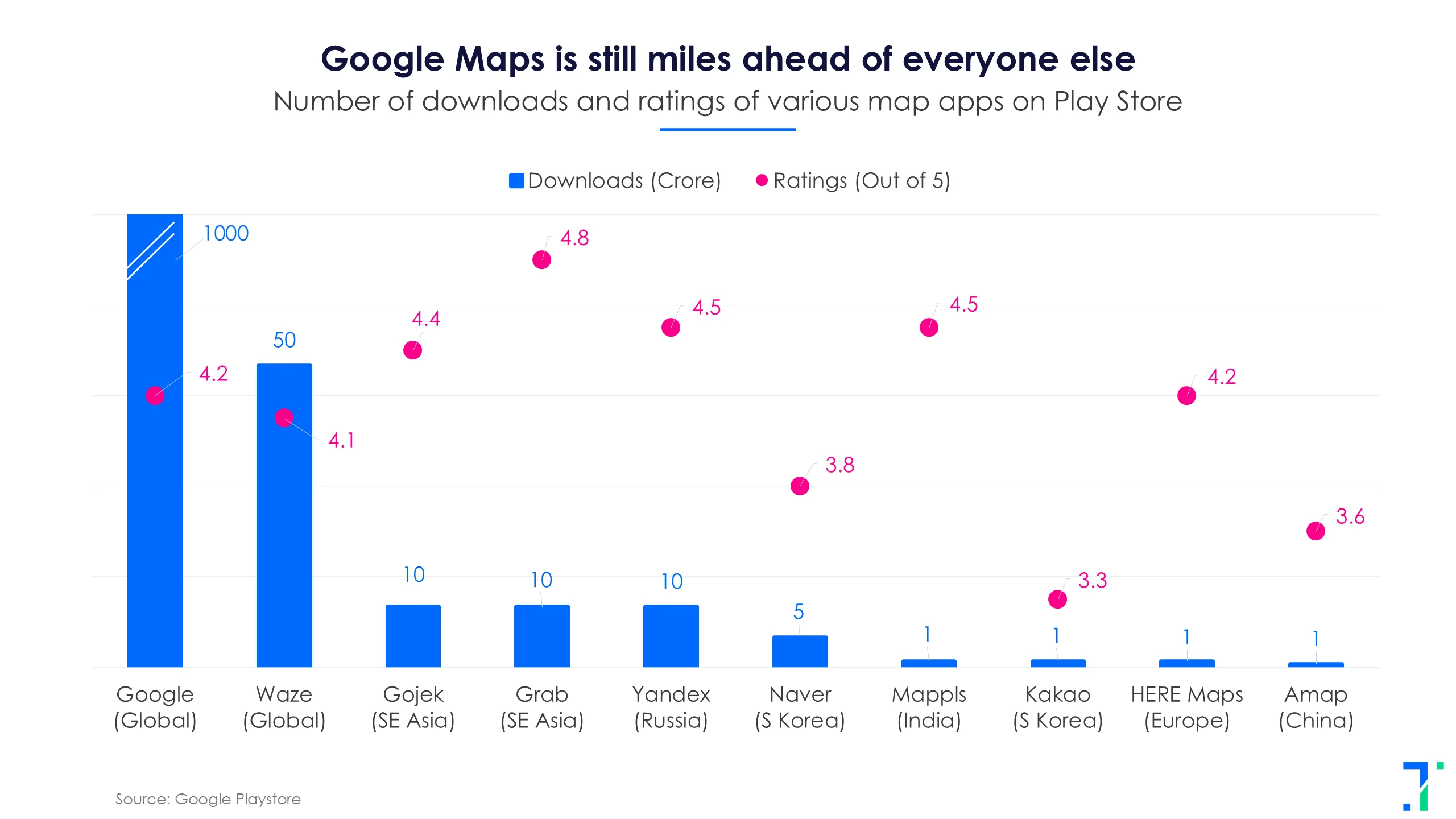 Enter MapmyIndia. In a world ruled by Google Maps, this player built a niche first with B2B and government projects, and later with its consumer app, Mappls. Users like how well it works in India's “gali–nukkad” neighbourhoods, where people will give you directions like, “turn left where the cow usually sits”.
