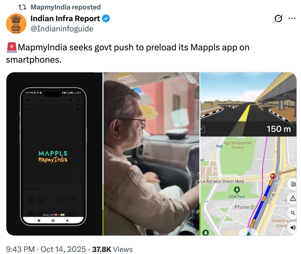 The message is clear: “Build Indian alternatives to global products, and the government will back you.” MapmyIndia’s own X feed proudly promotes itself as the “swadeshi” alternative.