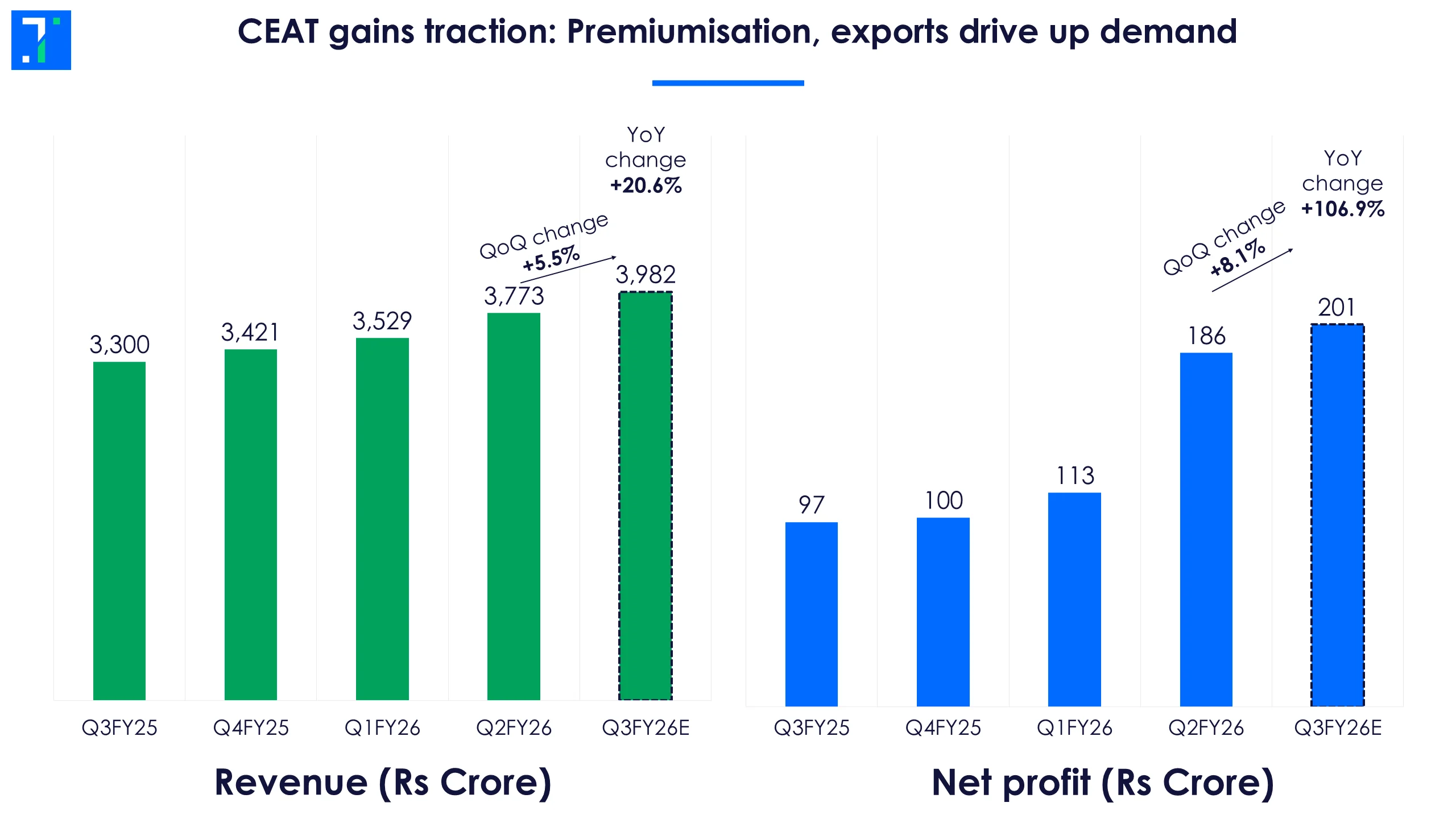 The competitive backdrop is also evolving, with other tyre-makers also focusing more on premium tyres. Risks for CEAT include raw material volatility, pricing pressure from OEMs and higher freight costs for export markets. CEAT derives around 20% of its revenue from exports.