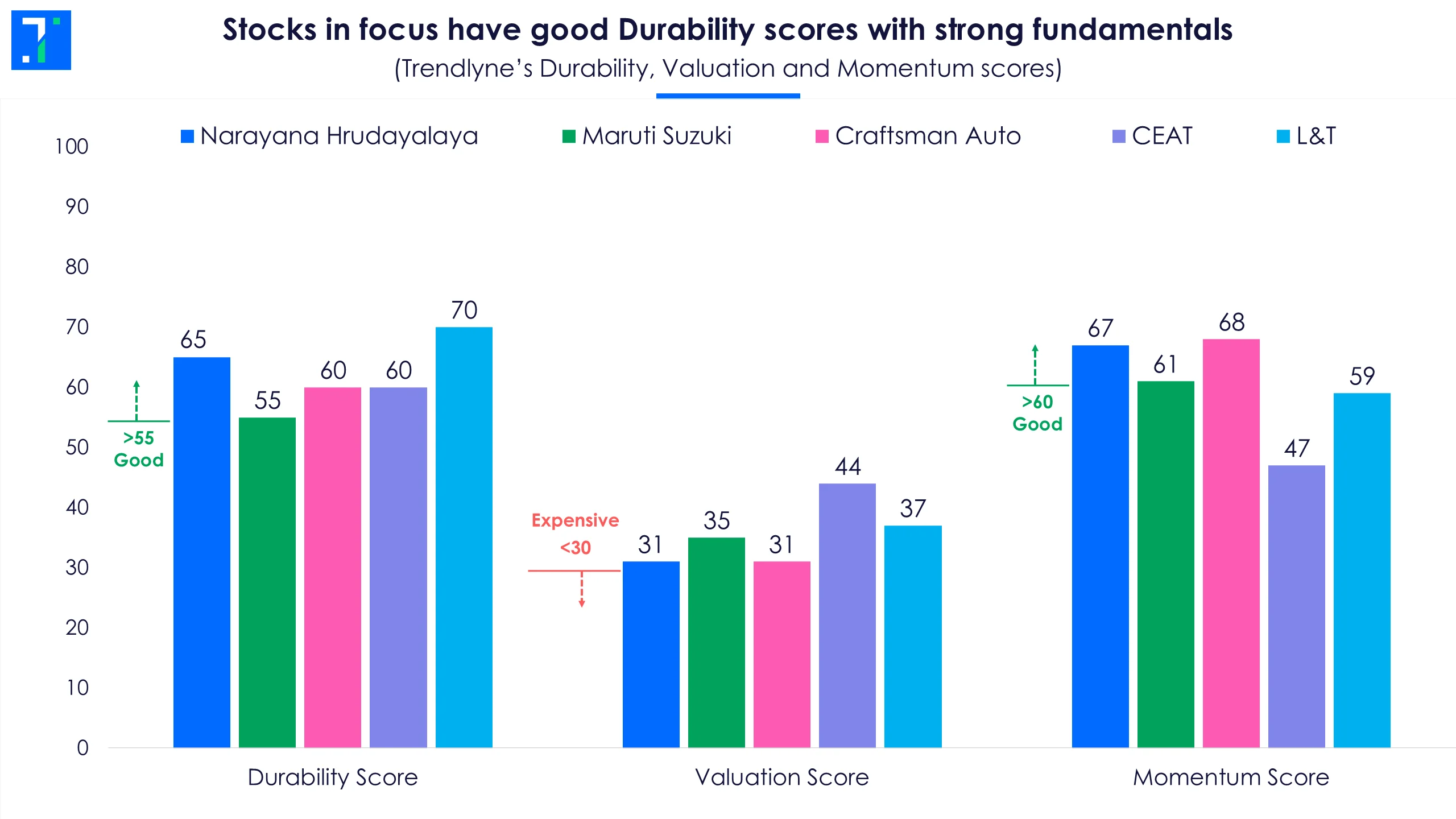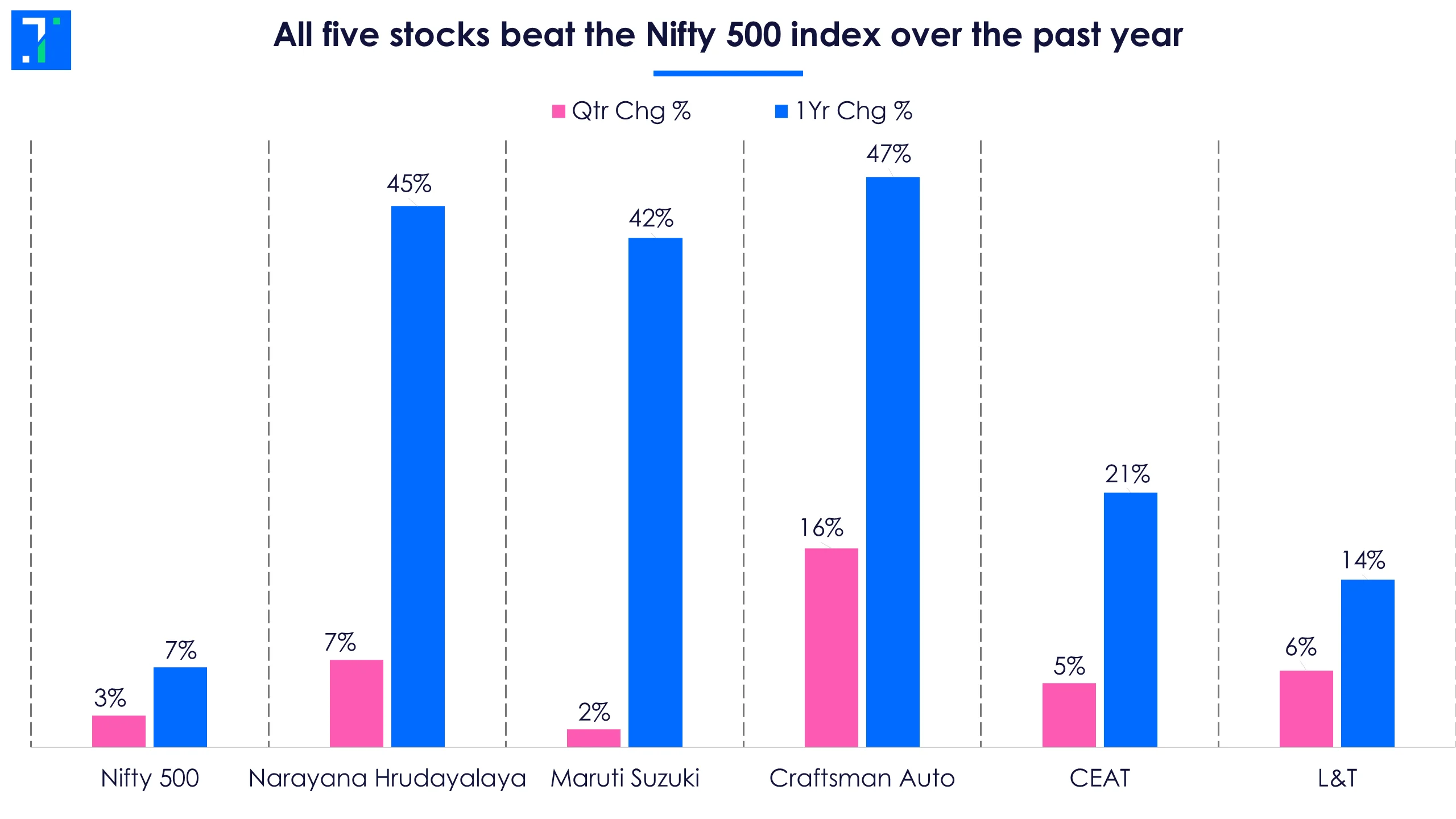 The auto sector is looking strong here, with three of five stocks — Maruti Suzuki, Craftsman Automation and CEAT. The other two stocks are Narayana Hrudayalaya and Larsen & Toubro.
