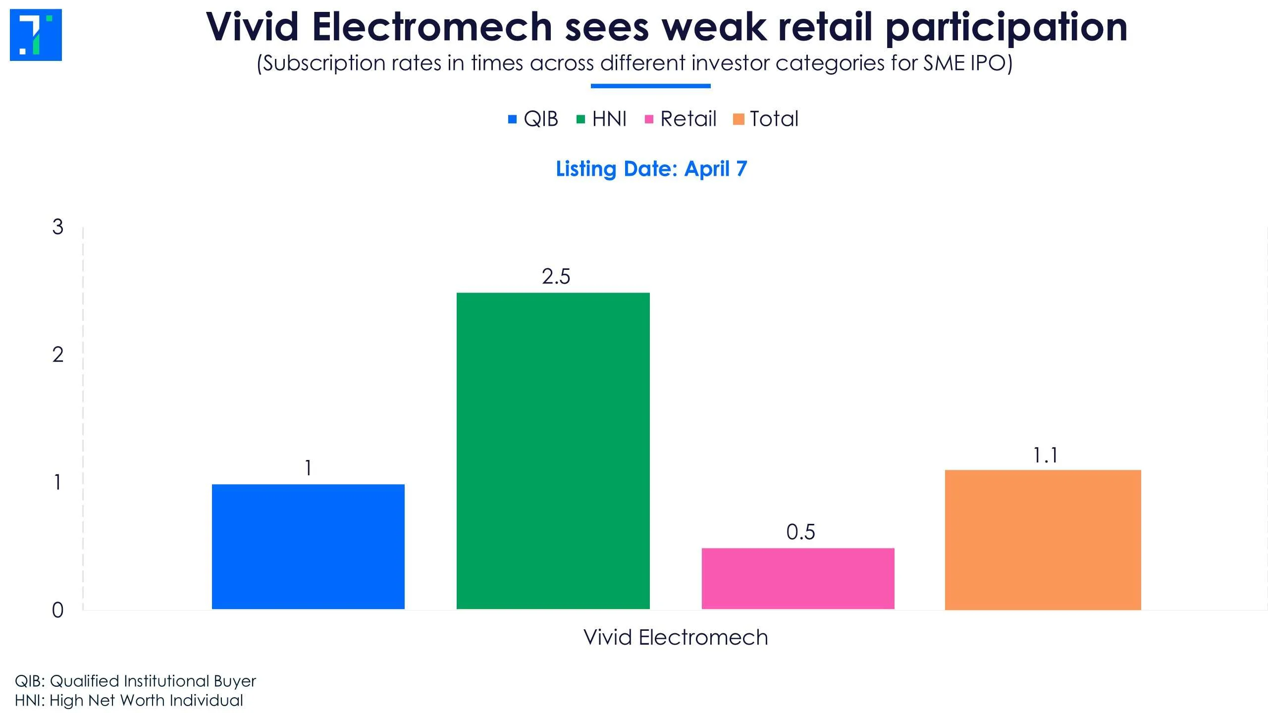 Vivid Electromech, a manufacturer of electrical panels and automation systems, concluded its Rs 130.5 crore IPO on March 30. The offering saw a modest overall subscription of 1.1X. While institutional and non-institutional interest helped the issue cross the line—with QIBs and HNIs subscribing 1X and 2.5X respectively—retail participation remained subdued at 0.5X. The IPO was priced in a band of Rs 528-555 per share and comprised a fresh issue of 18.8 lakh shares alongside an offer for sale of 4.7 lakh shares.